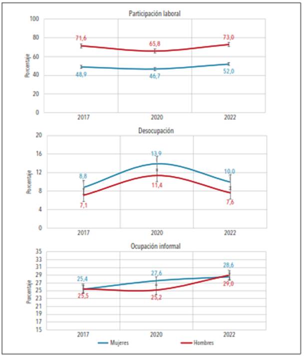 La etapa pospandémica ha exhibido una lenta recuperación. La participación laboral ha mejorado, pero la informalidad sigue siendo alta. El mercado laboral formal no ha podido absorber completamente a los trabajadores y a las trabajadoras que fueron desplazados, lo que ha mantenido niveles significativos de empleo informal, especialmente en mujeres y en jóvenes (CEPAL 2021).