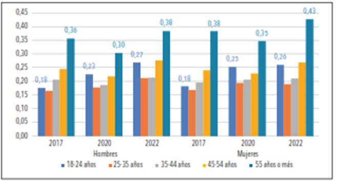 Para hombres y mujeres existe heterogeneidad según tramos de edad (figura 2), ya que los mayores porcentajes de informalidad se presentan en personas con 55 años o más y en segundo lugar, en personas entre 18 y 25 años. Es decir, las tasas de ocupación informal tienen una forma de u: las personas jóvenes y los adultos mayores presentan una mayor probabilidad de trabajo informal. En ambos segmentos de edad, y para hombres y mujeres, han aumentado las tasas de informalidad en el tiempo.