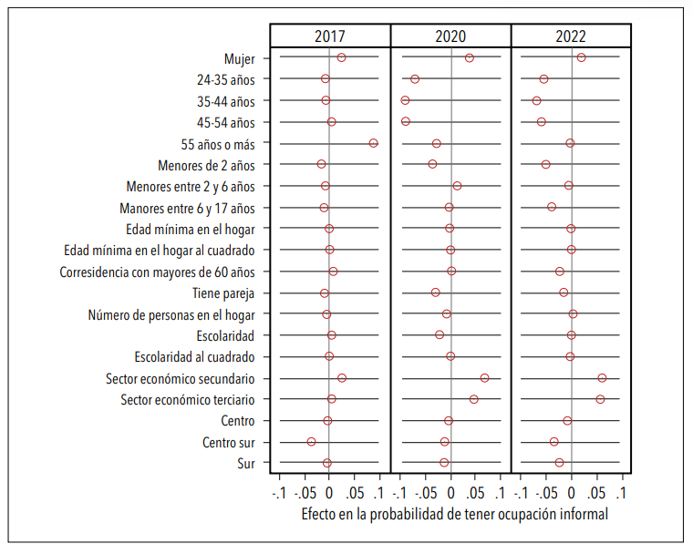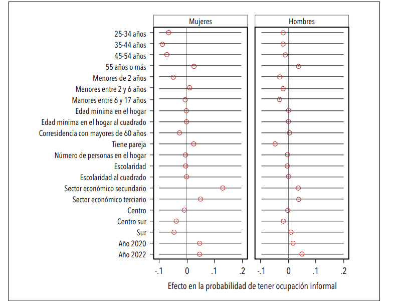 También se encuentran diferencias por sexo, sector económico y zona. Mientras las mujeres en el sector secundario tienen mayor probabilidad de informalidad (13,3 p.p.) que aquellas en el sector primario o terciario, para los hombres el efecto marginal es menor en el sector secundario (3,2 p.p.) y cercano en el terciario (4,8 p.p.). Respecto a la zona, las mujeres en lugares distintos al norte ven disminuida su probabilidad de ocupación informal, mientras que los hombres tienen mayor probabilidad de informalidad en el sur que en el norte (0,9 p.p.).