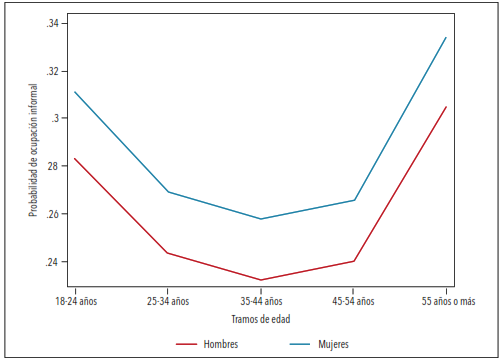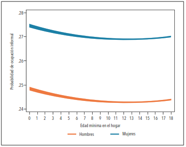 Por último, la predicción de la probabilidad de informalidad en función de la edad de la persona más joven del hogar (figura 9), da cuenta de una brecha entre hombres y mujeres. En todas las edades de la persona menor existe mayor probabilidad de ocupación informal para las mujeres respecto a la probabilidad predicha para los hombres. Si bien la probabilidad es decreciente en la edad de la persona menor, la tasa a la cual decrece es de baja magnitud, lo que hace que la probabilidad de informalidad para las mujeres no baje de 27 %. En el caso de los hombres, esta se mantiene alrededor del 25 %. Los resultados presentados resaltan la importancia de complementar políticas laborales con políticas de cuidado (Cecchini y Martínez 2016; Esquivel 2015).