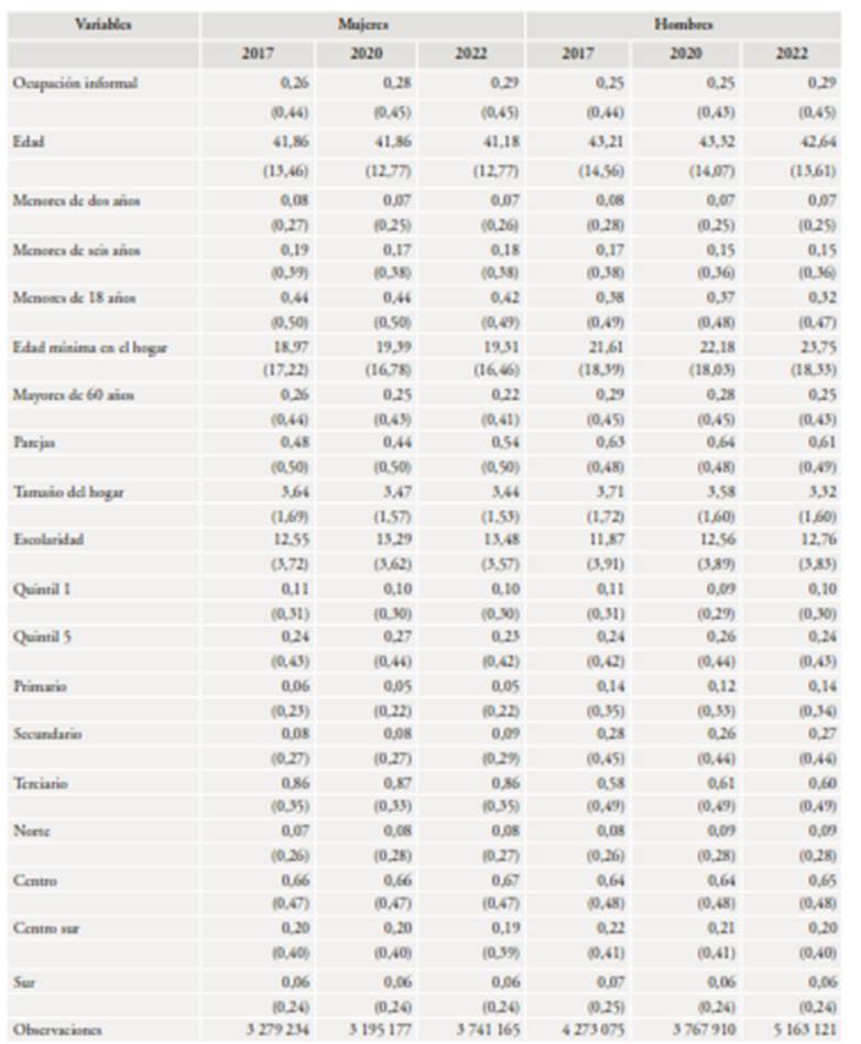 Las estadísticas descriptivas por sexo y año de las variables utilizadas en el modelo de determinantes de informalidad laboral se pueden apreciar en la tabla 2. Las estimaciones incluyen a todas las personas ocupadas en el periodo de análisis.