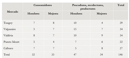 Los espacios seleccionados son los siguientes: feria y mercado de Calbuco, Mercado Municipal Presidente Ibáñez de Puerto Montt, feria fluvial de Valdivia, mercado de la Caleta Portales de Valparaíso y mercado de Tongoy (figura 1). El trabajo etnográfico se realizó entre abril de 2021 y mayo de 2023, se aplicaron 1009 cuestionarios estandarizados y 146 entrevistas distribuidas en los cinco mercados (y en territorios aledaños), complementadas con observaciones etnográficas registradas en cuadernos de campo. Se utilizó un criterio muestral no probabilístico o estructural (Montañés 2013), procurando lograr una saturación discursiva en cada MCL, de tal modo que en la práctica se aplicaron alrededor de 200 cuestionarios diferenciados en comerciantes y consumidores, con distinción equilibrada de sexo.