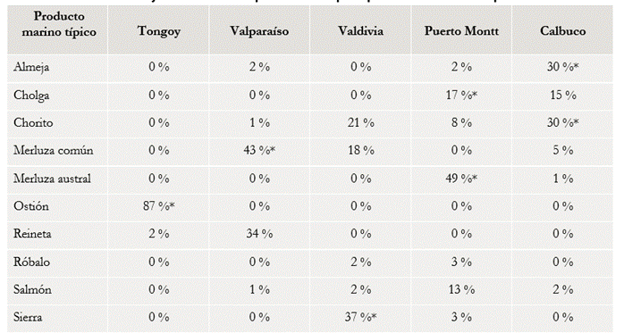 A partir de la pregunta abierta planteada en el cuestionario sobre la tipicidad de los productos del mar, las respuestas tienden a asociar lo típico a lo local y a lo frecuente (a lo que predomina en lo que respecta a volumen de oferta y demanda), concretamente señalando que se trata de “algo de la zona”, “lo que más se vende”, “lo que se consume frecuentemente”, “algo común”, “producto del mar” (mercado de Tongoy). También “lo propio del lugar”, “lo que es de aquí”, “lo tradicional”, “asociado a costumbres” (Caleta Portales, Valparaíso).