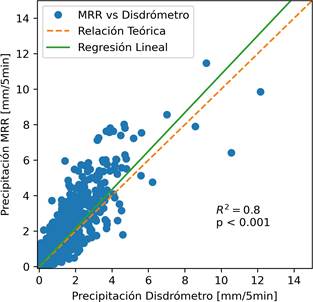 Se utilizaron 5 años de mediciones del MRR en el periodo de febrero 2017 a enero de 2022. Las observaciones del MRR contaron con una resolución temporal y altitudinal (espesor de bandas) de 1 minuto y 100 m, respectivamente. El MRR mide la precipitación hasta una altura de 3100 m sobre el nivel del terreno (es decir, desde 2600 hasta 5700 msnm). Las variables usadas corresponden a la reflectividad e intensidad de lluvia. Para rellenar vacíos y eliminar datos atípicos para la intensidad de lluvia medidaen la banda más baja se utilizaron mediciones de un disdrómetro laser (Thies Clima Laser), ubicado en el mismo observatorio meteorológico. El porcentaje de mediciones faltantes para esta variable se redujo de 15,7 % a 6,0 %. Para esto, se realizó una correlación lineal entre la lluvia acumulada cada 5 minutos para ambos dispositivos (Figura 2). Pese a que el MRR mide la intensidad promedio en una banda de 100 m desde la superficie, su variabilidad puede ser explicada en un 80 % por el disdrómetro, como lo indica el coeficiente de determinación ( R 2 ); además, el valor-p es menor que 0,001.