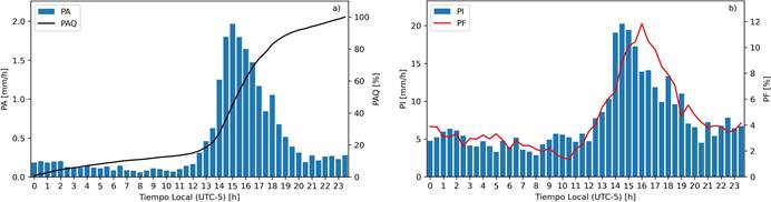 Si bien esta intensidad puede considerarse baja, se debe notar que es el promedio de todos los eventos medidos en el intervalo. La magnitud de los eventos que se desarrollan en este intervalo, y los adyacentes, se puede evidenciar contrastando PF y PA, ya que PF es aproximadamente el triple que en horas de la noche o de la mañana, pero las cantidades de lluvia acumulada pueden llegar a ser hasta 20 veces más. Esto indica que en estas horas ocurren eventos de altas intensidades que contribuyen con gran parte de la precipitación total.