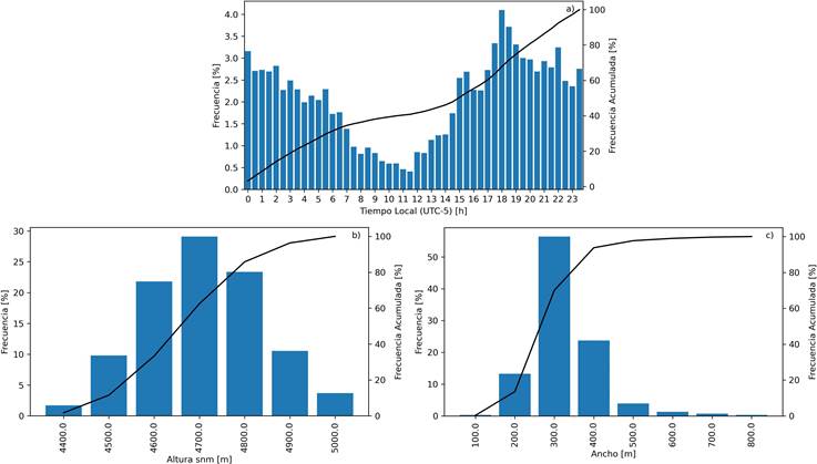 La Figura 4 presenta la caracterización de la BB en términos de a) Ciclo diario, b) Variación y frecuencia de la altura de su parte superior (HT) y c) Variación y frecuencia de su espesor (BBth). Se encontró que la mínima ocurrencia de la BB ocurre entre las 9:00 y las 12:00 h TL. A partir de allí, esta aumenta hasta alcanzar su pico máximo a las 18:00 h TL, donde inicia un periodo de decaimiento hasta repetirse el ciclo (Figura 4a).