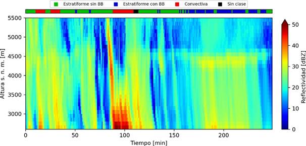 El 28 de diciembre de 2017 ocurrió un evento que engloba varias de las características mencionadas y por ello se seleccionó como caso de estudio. La Figura 5 muestra la evolución en el tiempo de su perfil de reflectividad y la barra de colores superior señala los momentos en los que se registraron las etapas convectivas, estratiformes con BB y estratiformes sin BB. () usó este mismo evento para ilustrar los resultados de la metodología mencionada en la sección 2.5 para clasificar tormentas en sus etapas convectivas o estratiformes, por lo que el análisis realizado en este estudio también complementa el mismo.