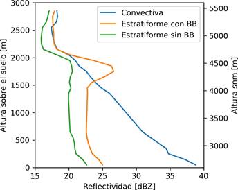En el caso de los PVPR de las etapas estratiformes, estos tienen un incremento de reflectividad considerable entre los 4700 y 4200 msnm que indican que la lluvia es originada por fusión ( , ), pero muestran un comportamiento diferente luego de alcanzar la reflectividad máxima en este rango, sugiriendo que en la etapa sin BB existe un rápido crecimiento de gotas que mantiene la reflectividad cercana a este valor. Además, por debajo de los 4200 m snm los PVPR de estas etapas tienen un comportamiento semejante, manteniendo valores relativamente constantes hasta aproximarse a la superficie donde se presenta un gradiente negativo. Este comportamiento estable se debe a que tanto los procesos de coalescencia, rompimiento de gotas y evaporación se mantienen en equilibrio; mientras que el incremento de reflectividad en alturas próximas a la superficie se explica por el dominio de procesos de coalescencia y agregación (, ; , ; , ).