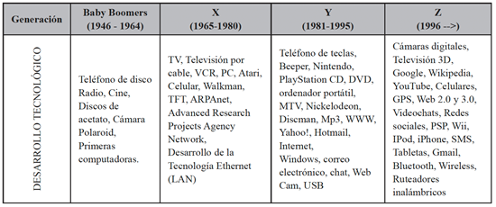 De acuerdo con Delgado-Velesaca et al. (2020), en la actualidad, los sistemas educativos cuentan con profesores de diversas generaciones, siendo la mayoría de ellos pertenecientes a las generaciones Baby Boomers y Generación X. Estos grupos se caracterizaron por su exposición temprana a tecnologías rudimentarias en una época en la que el mundo estaba experimentando con tecnología básica que condujo a avances futuros. Respecto a las características educativas de los “Millennials” o “generación Y”, nacidos entre 1981 y 1996, Cadena Miranda et al. (2020), mencionan que han crecido inmersos en la tecnología y son considerados nativos digitales. García-Flores et al. (2016) destacan que esta generación está altamente conectada con las TIC y puede acceder rápidamente a información educativa a nivel local y global. Su capacidad para buscar información sobre un tema enseñado por un docente de la generación del Baby Boomer es tan rápida que el docente puede quedarse rezagado en la búsqueda de información. La “Generación Z”, los nacidos entre 1995-2012, han estado expuestos durante más tiempo a las TIC que ninguna otra generación anterior (Fernández Pérez, 2021), según Jiménez-Macías et al. (2020) esta generación usa la tecnología desde que nacieron y se desenvuelven en su vida diaria.
