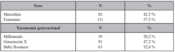 La muestra de estudio es no probabilística o dirigida (Hernández-Sampieri y Mendoza Torres, 2018). En este estudio se partió de una población de 382 docentes que forman parte de 40 establecimientos educativos pertenecientes a 17 zonas del sector urbano y rural de la provincia de Loja. Se seleccionó a docentes hombres y mujeres de distintas edades que imparten asignaturas en los niveles de básica superior y bachillerato general unificado de colegios fiscales, fiscomisionales y particulares en zonas urbanas y rurales de la ciudad de Loja. La muestra quedó conformada por 193 profesores, de los cuales 111 son mujeres y 82 varones, los rangos de edades que prevalecen son de 35 a 64 años. Se aseguró que la muestra fuera representativa con un Nivel de Confianza del 95 %. En la tabla 2 se detallan las características de los participantes.