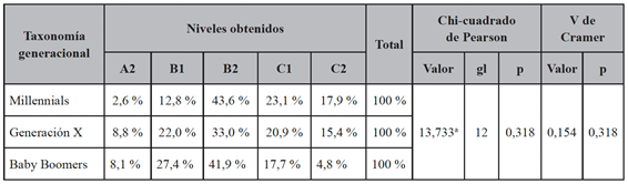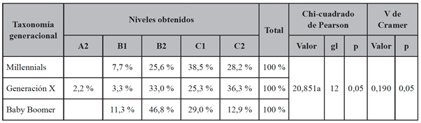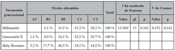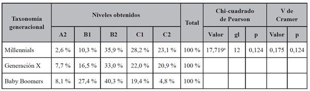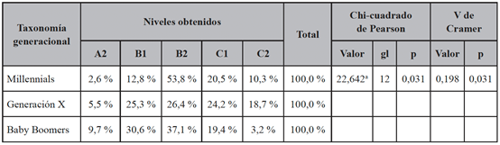 Los resultados revelan una relación moderada (V de Cramer = 0.198) entre la edad y la competencia digital docente. Los Millennials (21-34 años) muestran una alta competencia digital, con la mayoría en el nivel B2 (53,8 %). La Generación X (35-49 años) presenta una distribución más uniforme de niveles de competencia, siendo B1 (25,3 %) el más común. Los Baby Boomers (50-64 años) tienden a tener niveles más bajos de competencia, con la mayoría en B2 (37,1 %) y B1 (30,6 %). Estos hallazgos subrayan la influencia de la edad en la competencia digital docente y las diferencias generacionales en este aspecto.