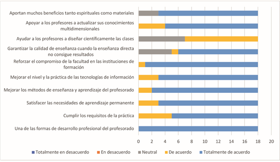 El 94,4% está de acuerdo en que el aprendizaje profesional en línea mejora la participación docente dentro de la institución. Esto demuestra que consideran el valor del aprendizaje en línea en la creación de la cohesión e interacción entre profesores e instituciones, mejorando así la calidad de la experiencia de enseñanza y aprendizaje. El 66,7 % está de acuerdo que el aprendizaje profesional en línea garantiza la calidad de la enseñanza cuando la enseñanza presencial no logra resultados. Los datos muestran que el aprendizaje en línea puede ser una alternativa eficaz cuando las formas tradicionales de enseñanza no ofrecen los resultados deseados. Ninguno de los encuestados estuvo de acuerdo en que el aprendizaje profesional en línea ayuda al profesorado a diseñar conferencias científicas. Esto sugiere que hay un discernimiento en las opiniones de los participantes de la encuesta, y puede haber diferentes opiniones sobre la posibilidad de aprendizaje en línea en el diseño del contenido. El 77,8 % está totalmente de acuerdo en que el aprendizaje profesional en línea ayuda al profesorado a actualizar los conocimientos multidimensionales.