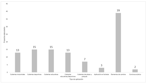 The systematic and typological classification has allowed the identification of the main applications of membranes in tensile structure projects in Ecuador (Figure 2). There are 39 projects notably focused on shade elements, with an average coverage area of 399 m². These structures are primarily constructed in dining spaces, parking lots, corridors, public transport stops, terraces, bleachers, and as urban furniture.