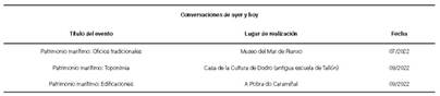 Se desarrolla un proceso denominado Conversaciones de ayer y hoy, constituido por tres eventos participativos. El objetivo es, por un lado, trasladar a parte de la ciudadanía, estudiantes universitarios y agentes locales los conocimientos que arroja la investigación sobre el patrimonio marítimo construido de su entorno y, por otro lado, sensibilizarlos en su valorización. Durante la fase de preparación y diseño se trata de invitar a la participación de personas de diferentes edades y ámbitos, intentando conseguir una heterogeneidad que aporte valor a las conversaciones. Se habilita y difunde una dirección de correo electrónico del proyecto para recibir fotografías antiguas, sugerencias o relatos de los agentes locales sobre las edificaciones y construcciones representativas de la zona, que sirvan de guía para preparar las mesas y de apoyo en su realización. En cada evento se decide profundizar sobre un bloque temático del patrimonio marítimo (Oficios tradicionales, toponimia y edificaciones) durante media jornada, eligiendo para albergarlos localizaciones repartidas por el área de estudio (Tabla 1), de manera que los agentes locales de cada parte del ámbito puedan asistir al menos a un evento en algún emplazamiento próximo.