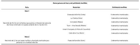 A partir de la geolocalización en mapas de acceso público de los elementos inventariados en el proyecto, se crean posibles recorridos para que el público general pueda acercarse al patrimonio de manera recreativa en rutas diseñadas para hacer a pie, identificando su longitud y principales características de accesibilidad. Las rutas recorren áreas de especial interés paisajístico-patrimonial donde se pueden encontrar algunos de los vestigios más representativos del patrimonio marítimo inmueble, se proponen cuatro áreas: Broña (Outes), Porto do Son, Area Secada-Touro (Ribeira) y Boiro.