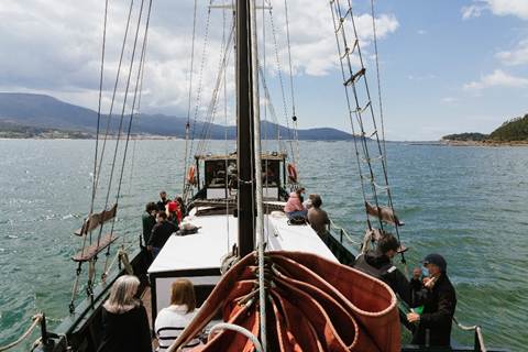 Se planifica una jornada de ruta en el balandro Joaquín Vieta, construido en madera entre 1915 y 1916 en una de las históricas carpinterías de ribera de O Freixo (Outes) y restaurado para uso recreativo y divulgativo en 2010. El recorrido comienza desde el puerto de O Freixo, Outes, y cubre parte de la ría de Muros-Noia. Desde la embarcación (Figura 3) se puede visualizar el patrimonio arquitectónico estudiado en este proyecto, presente en toda la costa, y el existente en el medio de la ría, como son las bateas. La embarcación cuenta con un gran camarote que, permite combinar actividades en cubierta y en su interior, pudiéndose usar como sala de reuniones para el grupo de expertos integrantes de dicha ruta.