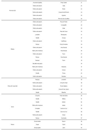 El trabajo de campo realizado culminó con el inventariado de sesenta construcciones (Tabla 3) en este tramo de costa de las rías de Muros-Noia y Arousa, en Galicia.