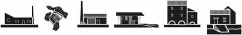 Figura 4: Esquemas de las seis tipologías de arquitecturas del borde litoral. De izquierda a derecha: (1) fábricas, (2) cetáreas, (3) aserraderos, (4) carpinterías de ribera, (5) molinos y (6) elementos auxiliares.