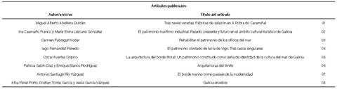 En cuanto a la divulgación científica y académica, el volumen Patrimonio marítimo: el patrimonio marítimo de los caminos del mar a Santiago (2021) agrupa ocho colaboraciones de personas expertas e investigadores (Tabla 4) además de las imágenes de los elementos inventariados. Se distribuyen los quinientos ejemplares de manera gratuita entre instituciones, asociaciones e investigadores, para que sea accesible al público experto interesado en la materia. Adicionalmente, el libro está disponible de forma libre y gratuita durante un año en la página web asociada al proyecto.