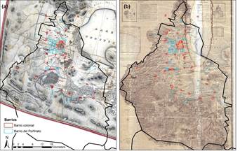 Figura 1 Distribución de los barrios y del Zócalo dentro del contexto de la extensión de la actual Ciudad de México. Los mapas de fondo del panel (a) corresponden al año 1753 para el Zócalo y de 1847 para el resto de la ciudad (periodo Colonial); y del panel (b) se refiere al año 1899 (periodo del Porfiriato).