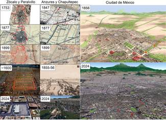 Fuente: Elaboración propia, para más detalles referirse a la sección de métodos. Las imágenes de fondo corresponden a los mapas históricos. La litografía de Chapultepec es de Casimiro Castro mientras que la del Zócalo es de Cristóbal de Villalpando. La imagen aérea es una litografía de Casimiro Castro tomada en globo por el Noroeste (1855-1856). Los renders 3D del año 2024 se desarrollaron en Google Earth Pro.
