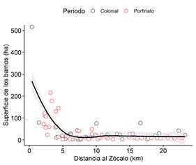 Nuestros resultados muestran que en ambos periodos los barrios tienen una relación inversa entre distancia al Zócalo y su tamaño (Figura 3). Los barrios más alejados del Zócalo son de menor tamaño (Figura 3). La distancia mínima en la que se observa estabilidad en el tamaño de los barrios es a los 5 km. Los barrios a más de 5 km muestran poca variabilidad en su tamaño. Sin embargo, resaltan cinco barrios que salen de este comportamiento, pese a estar alejados del Zócalo, su tamaño sobresale de la media. Tres barrios corresponden al periodo Colonial (Azcapotzalco, Santa Catarina y Tlalpam), mientras que dos se refieren a barrios del periodo del Porfiriato (Churubusco y Tlacoquemecatl) (Tabla 1).