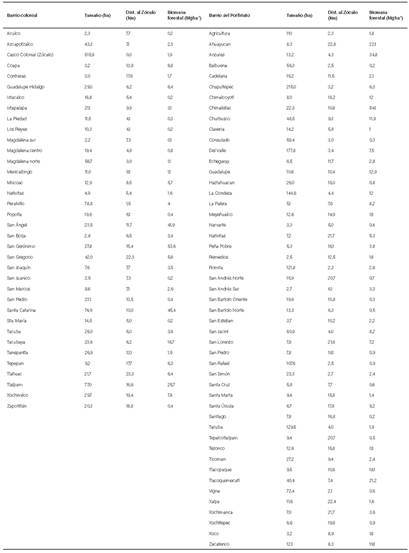 Las características de los barrios de tamaño y distancia al Zócalo es similar en ambos periodos (p>0,55). El tamaño medio de los barrios en ambos periodos es de 16,5±3,2 ha. El rango de tamaño oscila de 2,2 ha en los barrios más pequeños hasta 516 ha para el Zócalo. La distancia promedio de los barrios al Zócalo es de 8,2±2,1 km. El rango de distancia oscila de 400 m a 23,3 km (Tabla 1).