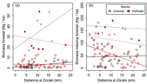 Figura 4 Biomasa forestal de cada barrio en función de la distancia al Zócalo. El panel (a) representa a la biomasa promedio al interior de cada barrio. El panel (b) corresponde a la biomasa máxima forestal estimada al interior de cada barrio. Los círculos con relleno sólido y línea de tendencia fragmentada corresponden a barrios de clases sociales altas. Los círculos sin relleno y las líneas de tendencia sólidas corresponden al resto de los barrios.