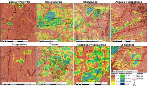 Figura 5 Distribución de la biomasa forestal en diferentes barrios coloniales, Zócalo, y del Porfiriato. Para facilitar la representación de la distribución de la biomasa forestal, se incluyeron en transparencia los mapas históricos.