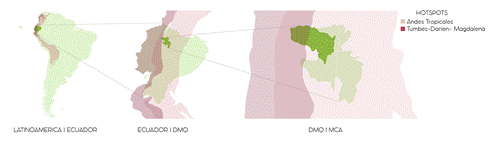 En la región del Chocó Andino del Distrito Metropolitano de Quito (DMQ) se encuentran dos superficies territoriales denominadashotspots; es decir, “áreas particularmente ricas en especies, especies raras, especies amenazadas o alguna combinación de estos atributos que se delinean cada vez más para ayudar a establecer prioridades para la conservación” (Reid 1998, p. 275). Estos hotspots son: (i) el Tumbes - Chocó - Darién - Magdalena y (ii) Andes Tropicales, que se extienden desde la costa del Pacífico hasta la cordillera de los Andes y desde Panamá hasta Bolivia, conforme indicados en la figura 2. Esta condición de extrema relevancia ambiental se reafirmó con la declaración del territorio del Chocó Andino de Pichincha como Reserva de la Biosfera por la UNESCO el 25 de julio de 2018.