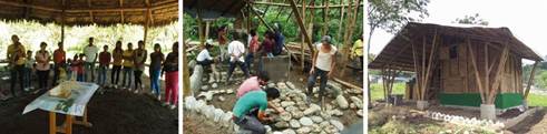 Figura 6: Restauración de la vivienda de la familia Pastrana. A la derecha, la vivienda antes de la intervención; en el medio, el proceso de construcción; y a la derecha, la casa restaurada y finalizada.