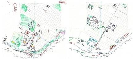 Figura 5: Cartografía Social de San José de Masphi. A la izquierda mapeo del estado actual de San José de Mashpi y a la derecha mapeo de un futuro deseado.