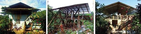 El convenio de vinculación con la sociedad entre la FAU-UCE y la ASOSEPAM posibilitó la elaboración de las propuestas arquitectónicas para la adaptación de cuatro viviendas de la comunidad para nuevas actividades turísticas. Cuatro grupos de estudiantes, coordinados por un docente, presentaron sus propuestas arquitectónicas acompañadas de la cuantificación de los materiales y definición del presupuesto para cada una de las intervenciones. Las propuestas arquitectónicas fueron desarrolladas a partir de tres eventos: el primero, dedicado a la socialización y articulación entre los actores; el segundo, destinado a la selección del material (bambú) utilizado en la construcción, y el tercero, mediante el co-diseño de los proyectos arquitectónicos junto a las familias. Este último fue un trabajo dialogado y concebido entre los dueños de los hogares y los estudiantes a partir de un proceso pedagógico. La universidad compartió conocimientos sobre lectura de planos y la comunidad compartió sus saberes sobre los materiales de la zona con el objetivo de generar propuestas constructivas. En la figura 6 se evidencia el proceso y finalización de una de las intervenciones arquitectónicas. Cabe recalcar, la formación de redes de colaboración dentro del proyecto de vinculación con la sociedad, ya que además de la ASOSEPAM y el OPTE FAU-UCE, en esta etapa del proyecto se vincularon la AEXCID y la Fundación Imaymana como entidad gestora y administradora.