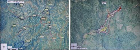 Figura 7: Cartografías participativas. A la izquierda identificación de los centros poblados en escala 1/30.000, y a la derecha mapeo de las características de cada centro poblado en escala 1/3.000
