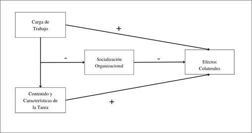 Dicho modelo que se muestra en la figura 1, se basó en la hipótesis de que la carga de trabajo tiene una relación directa sobre los efectos colaterales, e influye a través del contenido, características de la tarea (efecto incremental) y la socialización (efecto decremental), como variables mediadoras, las cuales forman una cadena causal que explica el impacto de la carga de trabajo en los efectos colaterales, como el equilibrio entre las características y contenido de los diferentes arreglos de trabajo, y la socialización organizacional como recurso protector.