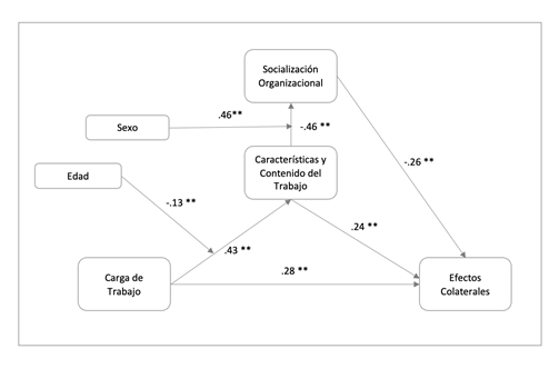 Los hallazgos principales de esta investigación revelan diferencias en los niveles de socialización, carga de trabajo, contenido y características del trabajo, y efectos colaterales, entre los trabajadores participantes, mostrando puntajes más altos en socialización y carga de trabajo. El análisis multivariado indicó que la carga y el contenido del trabajo influyen en los efectos colaterales, mientras que las perspectivas de futuro reducen estos efectos. En resumen, se identificó un modelo de mediación en el que la carga de trabajo tiene efectos directos incrementales en los efectos colaterales y efectos indirectos a través de la socialización organizacional (decrementales) y el contenido del trabajo.
