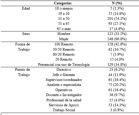 Se utilizó un muestreo no probabilístico por bola de nieve a profesionales de diversos sectores industriales de la República Mexicana, quienes estuvieran trabajando de manera remota o híbrida. Se encuestaron 383 profesionales, que tuvieran arreglos de trabajo en donde por lo menos un día se laboraba de forma remota, utilizando tecnologías de comunicación. Se excluyeron 12 respuestas inconclusas, resultando en una muestra de 371 cuestionarios completos.