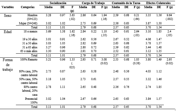 En la tabla 2 se evidencia que se encontraron diferencias por rangos de edad y sexo en los niveles de socialización. Quienes trabajaron 100% remoto, obtuvieron medias más altas en socialización organizacional y carga de trabajo; mientras que quienes colaboraron 80% laboral y 20% en casa, presentaron niveles más elevados en contenido y características de la tarea. La media de efectos colaterales fue más elevada en quienes trabajaron 80% desde casa.