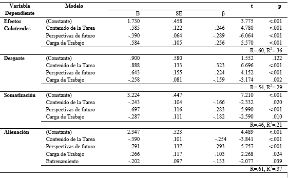 En la tabla 3, se muestra que los factores que influyen en el estrés de trabajadores con diferentes arreglos de trabajo; son la carga de trabajo, y el contenido y características de la tarea, mientras que las perspectivas de futuro decrementan su efecto. El desgaste y la somatización en los trabajadores son efectos de las mismas variables, mientras que la presencia de alienación en los trabajadores se incrementa por consecuencia de la carga de trabajo, así como el contenido y características de la tarea, y se decrementa por influencia de las perspectivas de futuro y el entrenamiento.