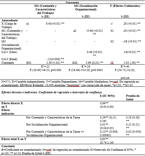 La tabla 4 incorpora los datos del análisis de mediación, realizado con técnicas de Bootstrapping, para modelar los efectos directos e indirectos entre la carga de trabajo, el contenido y características de la tarea, la socialización organizacional y los efectos colaterales, introduciendo las variables sexo y edad como confusoras. En esta se presentan los efectos directos e indirectos del modelo de mediación. El efecto predictivo directo estandarizado de la CT en los efectos colaterales fue 0.60 (intervalo de confianza (IC) del 95 % corregido por sesgo [0.39, 0.80], p= <0.001). Los efectos indirectos fueron los siguientes: en la vía de CCT - efectos colaterales, el efecto indirecto fue 0.18 (IC del 95 % corregido por sesgo [0.04, 0,09], p =< 0.001); en la SO- efectos colaterales, el efecto indirecto fue 0.13 (IC del 95 % corregido por sesgo [0.04, 0.09], p =< 0.001). Por último, en la vía de SO - CCT - efectos colaterales, el efecto indirecto fue 0.02 (IC del 95 % corregido por sesgo [0.008, 0.0006], p =< 0.001).