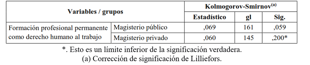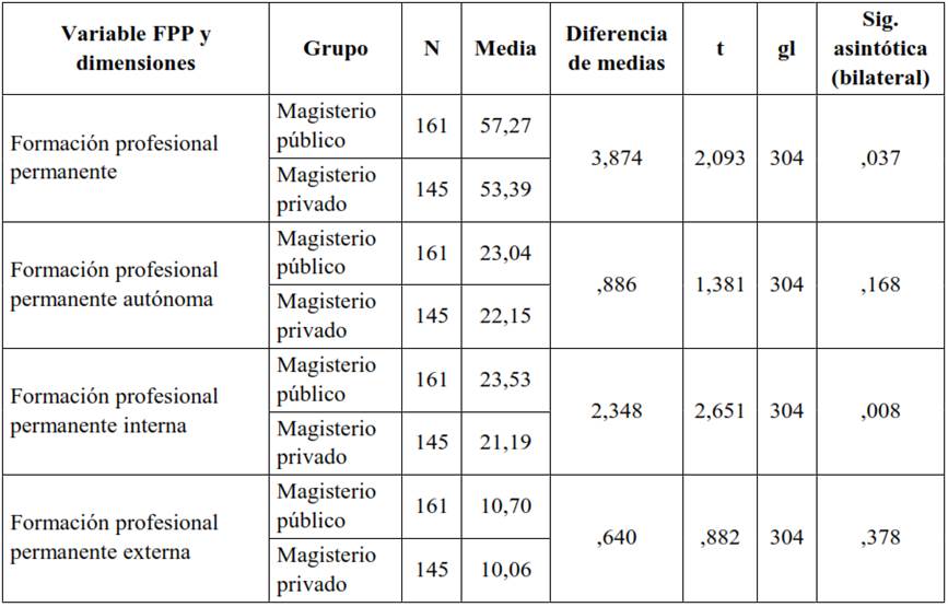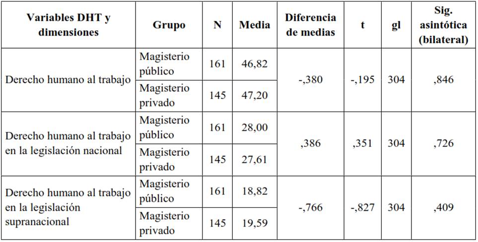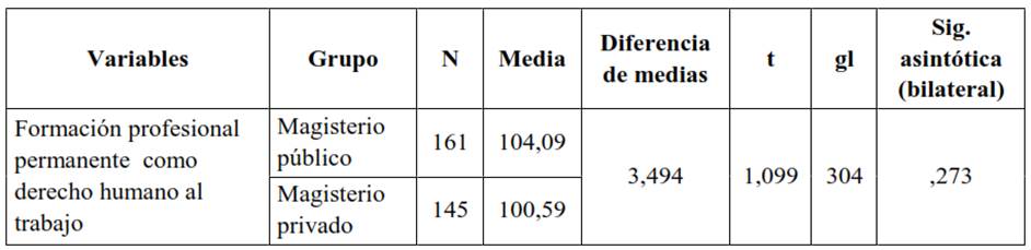 En cuanto a las hipótesis generales, el artículo de investigación planteó como Hi: Existen diferencias significativas en el nivel de implementación y conocimiento de la formación profesional permanente como derecho humano al trabajo entre el magisterio público y privado y H0: No existen diferencias significativas en el nivel de implementación y conocimiento de la formación profesional permanente como derecho humano al trabajo entre el magisterio público y privado.