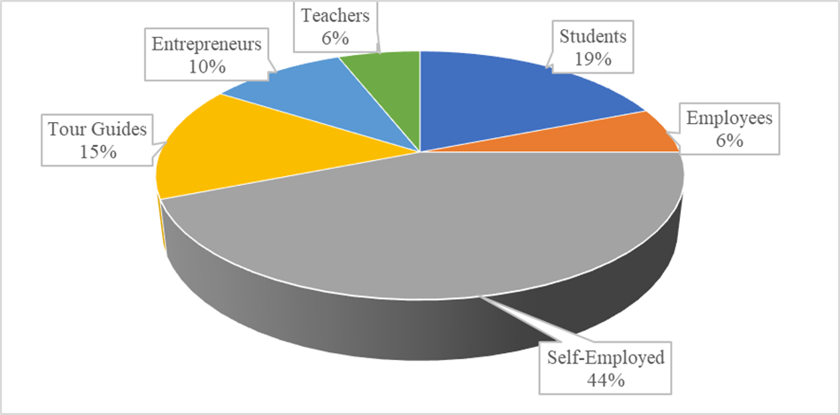 The demographic analysis reveals a diverse distribution in the sample, with the "Self-employed" category representing the highest proportion, reaching 44%. This figure suggests a significant presence of self-employed or freelance individuals in the population studied. "Students" constitute the second largest group, with 19%, indicating the presence of a young population or one in the process of academic training. 15% of "Tour guides" point to the importance of the tourism sector in the sample, possibly reflecting an active participation in the local tourism industry.
