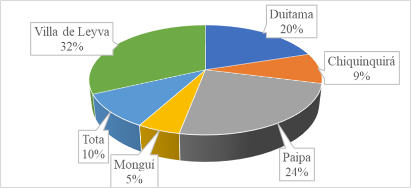 In the analysis of the data provided on the percentage distribution of the population in various municipalities, there is a notable demographic disparity among them. Villa de Leyva stands out with 31%, consolidating itself as the locality with the highest population concentration compared to the others. It is followed by Paipa, with 24%, and Duitama with 20%, forming an intermediate group in terms of population. In contrast, Tota and Chiquinquirá have more modest percentages, with 10% and 9%, respectively, suggesting a lower population density in these areas.