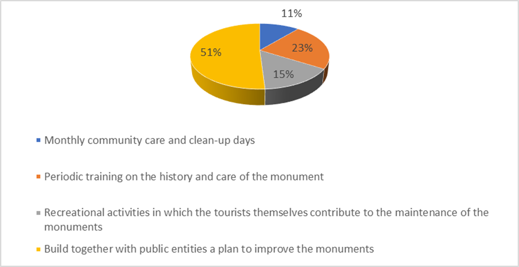 On the other hand, periodic training on the history and care of the monument received a solid 23%, indicating that knowledge and historical awareness play a crucial role in the community's perception of heritage conservation. Surprisingly, monthly community care and clean-up days, although valuable, receive only 11%, highlighting that the population considers other strategies to be more impactful. Recreational activities that involve the tourists’ contribution are also valued, although to a lesser extent, with 15%. Taken together, these results indicate the need for a comprehensive approach combining community engagement, education and collaboration with authorities to ensure the long-term sustainability of monument conservation (figure 7).