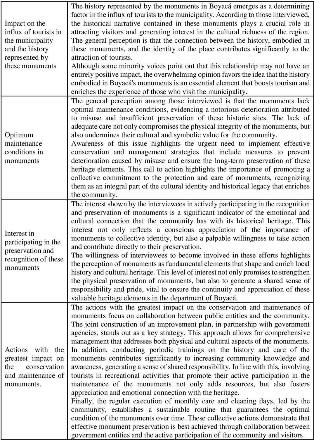 Understanding how the community perceives, values and is involved in the protection of monuments in Boyacá is crucial for designing effective conservation strategies. Interaction between local authorities, cultural heritage experts, and local inhabitants is a vital component to ensure the sustainability and continuity of these initiatives (Tai et al., 2020). Likewise, community involvement not only implies the physical conservation of monuments, but also the promotion of a sense of belonging and shared responsibility towards these historic sites, thus fostering the preservation of cultural identity and the rootedness with the past (Thompson, 2022).