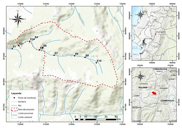 El muestreo in situ se realizó en el río Diablo Sacha, se utilizó el software QGIS para distribuir homogéneamente las estaciones en diferentes altitudes, como se muestra en la Figura 1. Se consideró que los puntos a bajas altitudes podrían estar más expuestos a la influencia humana. Posteriormente, se efectuó una visita de campo para verificar que estas estaciones fueran accesibles y representativas. Las estaciones están distribuidas entre los 3352 m.s.n.m (E1) a los 4100 m.s.n.m (E10), cada una de ellas está separada aproximadamente por 2 km de distancia. Se realizaron tres campañas de monitoreo durante los meses de agosto 2023 a enero 2024, que corresponde a la época seca (agosto 2023), época de transición (octubre 2023) y época lluviosa (enero 2024), es importante destacar el elevado esfuerzo de monitoreo involucrado en el estudio, el cual requirió cerca de 9 horas de caminata para recorrer completamente el área por cada salida de campo, subrayando así el compromiso y la exhaustividad del proceso de recolección de datos. En las campañas de muestreo fueron medidos los parámetros fisicoquímicos del agua, se recolectaron especies de macroinvertebrados y, finalmente, se determinó la calidad del agua a través de la identificación de macroinvertebrados.