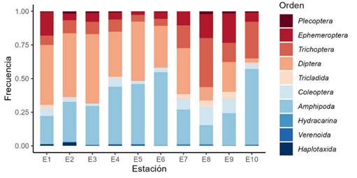 La Figura 2, presenta la distribución porcentual de los órdenes de macroinvertebrados acuáticos en las estaciones de muestreo a lo largo del río Diablo Sacha. En total, se registraron y clasificaron 7654 individuos, los cuales pertenecen a 34 familias distribuidas en 10 grupos taxonómicos distintos. Cada barra del gráfico representa la composición de la comunidad de organismos en una estación de muestreo específica, cada uno de los colores indican, la contribución de cada grupo taxonómico a la abundancia total. En orden de abundancia los grupos más representativos son Trichoptera y Diptera; seguidos de Ephemeroptera, Coleoptera y Amphipoda; y finalmente Tricladida, Pleclóptera, Hydracarina, Verenoida y Haplotaxida.