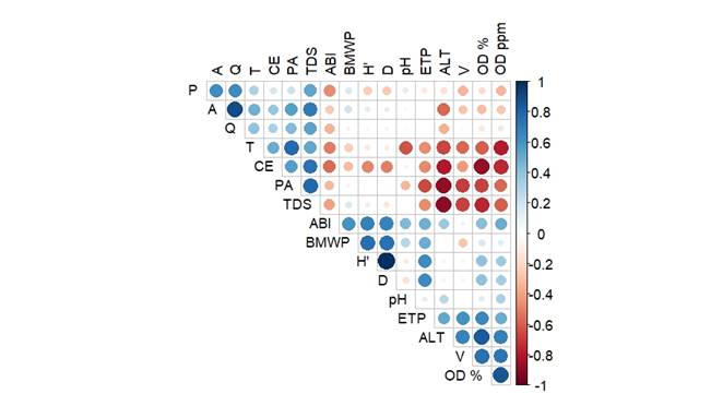 Los resultados mostrados en la fase de campo (análisis fisicoquímico), laboratorio (identificación de macroinvertebrados), y análisis de datos (Índice de Simpson, Índice de Shannon, BMWP/Col, ABI y EPT), vienen descritos de manera individual y, posteriormente, se analizan de manera conjunta mediante una correlación, y finalmente las variables más importantes son analizadas mediante un ACP, con la finalidad de conocer cuáles son los componentes que mejor explican la variabilidad de las condiciones del río.