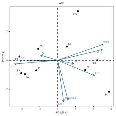 Para analizar los factores que más influyen en la variabilidad de la calidad del agua del río Diablo Sacha en las 10 estaciones de monitoreo, se implementó un ACP, cuyos resultados se presentan en la Figura 5. Este análisis permitió reducir las variables originales a tres componentes principales: PC1, PC2 y PC3, que explican el 39.36%, 25.36% y 16.06% de la varianza, respectivamente. En conjunto, estos componentes representan el 80.78% de la varianza total de los datos. La ALT, T, OD (%) tienen las contribuciones más altas en la PC1. Tales contribuciones están fuertemente influenciadas por las condiciones ambientales que sustentan la biodiversidad única de los páramos. Los índices BMWP/Col y ABI, son los que más contribuyen al PC2, es decir, esta dimensión está influenciada por el tipo de macroinvertebrados presentes. De igual manera en lo que respecta a PC3, las variables fisicoquímicas de pH y CE tienen las contribuciones más importantes para esta dimensión.