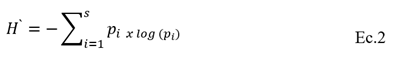 La ecuación 2 muestra el índice de Shannon H^` que cuantifica la diversidad y equitatividad de las familias presentes, es decir, considera tanto la cantidad de familias como la uniformidad en la distribución de individuos entre esas familias (17).